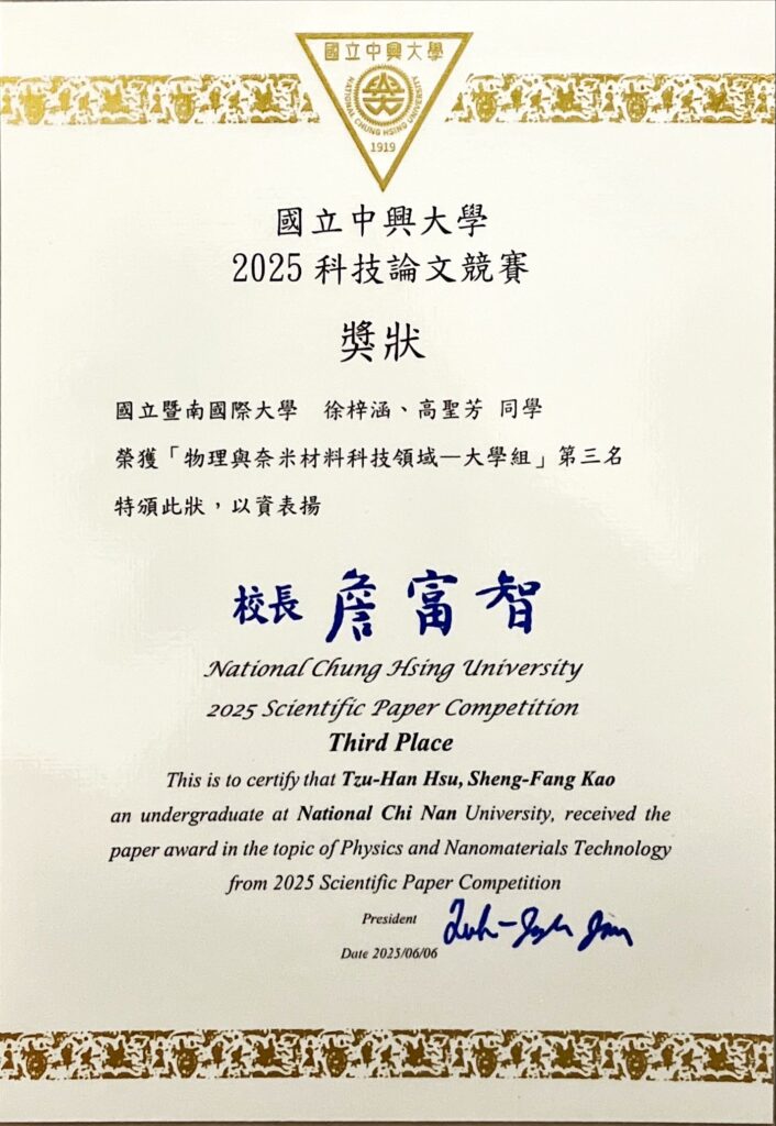 2025 中興論文獎榮獲「物理與奈米材料科技領域一大學組」第三名(徐梓涵高聖芳)